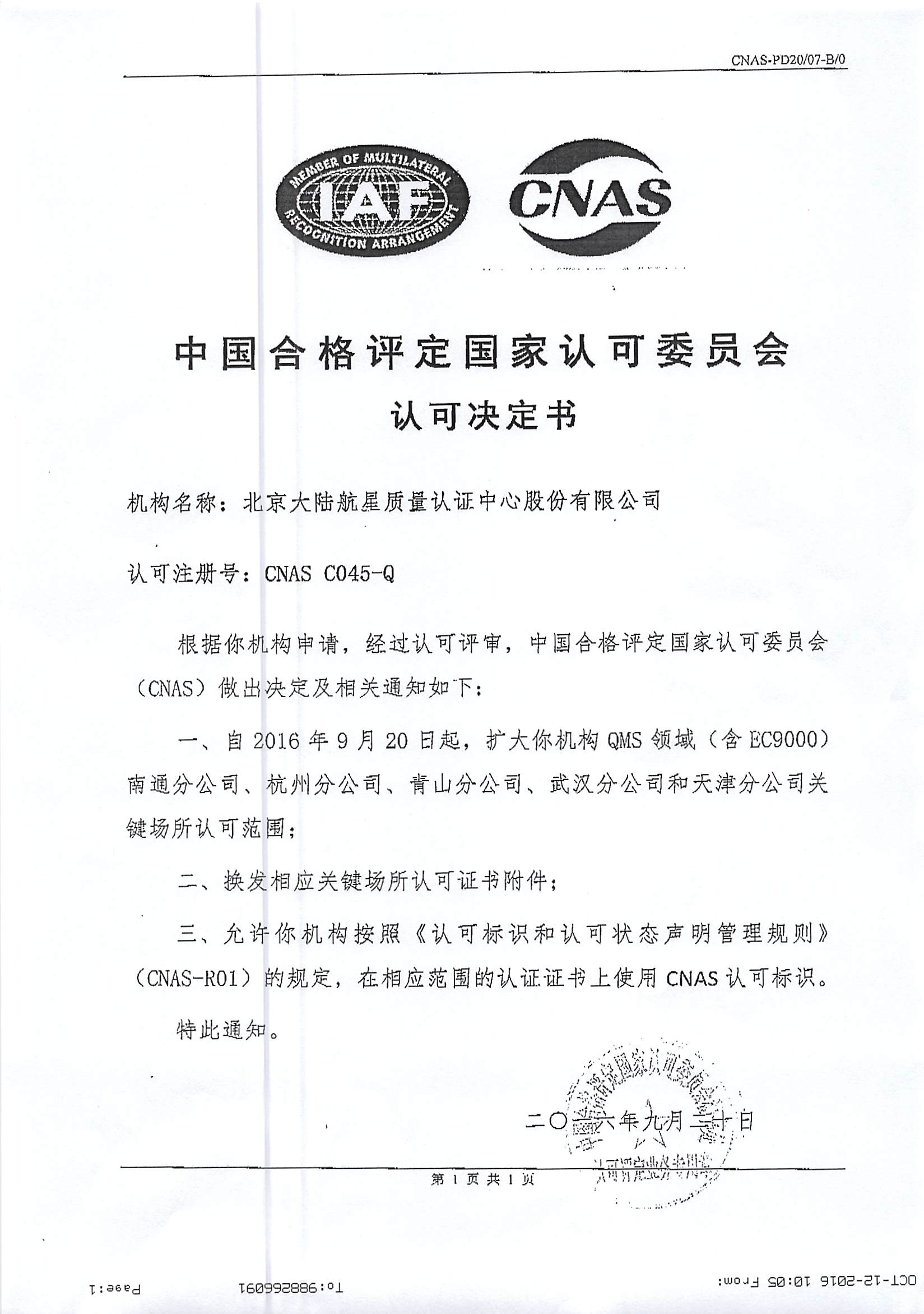 在管理層團(tuán)隊(duì)的引領(lǐng)下,經(jīng)總部各部門、各分支機(jī)構(gòu)及相關(guān)人員的共同努力,北京大陸航星質(zhì)量認(rèn)證中心股份有限公司(以下簡稱HXQC),順利通過中國合格評(píng)定國家認(rèn)可委員會(huì)(CNAS),對(duì)我公司進(jìn)行的例行監(jiān)督、轉(zhuǎn)換及擴(kuò)大評(píng)審。保持了QMS(含EC9000)、EMS、OHSMS和FSMS認(rèn)證領(lǐng)域的認(rèn)可資格,并通過了CNAS-CC01:2015和CNAS-SC15:2015轉(zhuǎn)換評(píng)審,同時(shí)擴(kuò)大了我公司QMS(含EC9000)認(rèn)證領(lǐng)域南通分公司、杭州分公司、青山分公司、武漢分公司和天津分公司5個(gè)關(guān)鍵場所。